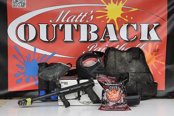 • Our standard package, including an Etha EMEK gun w/ gravity-fed hopper, mask, body armor, 2 pods, and a bag of paintballs (500 balls).